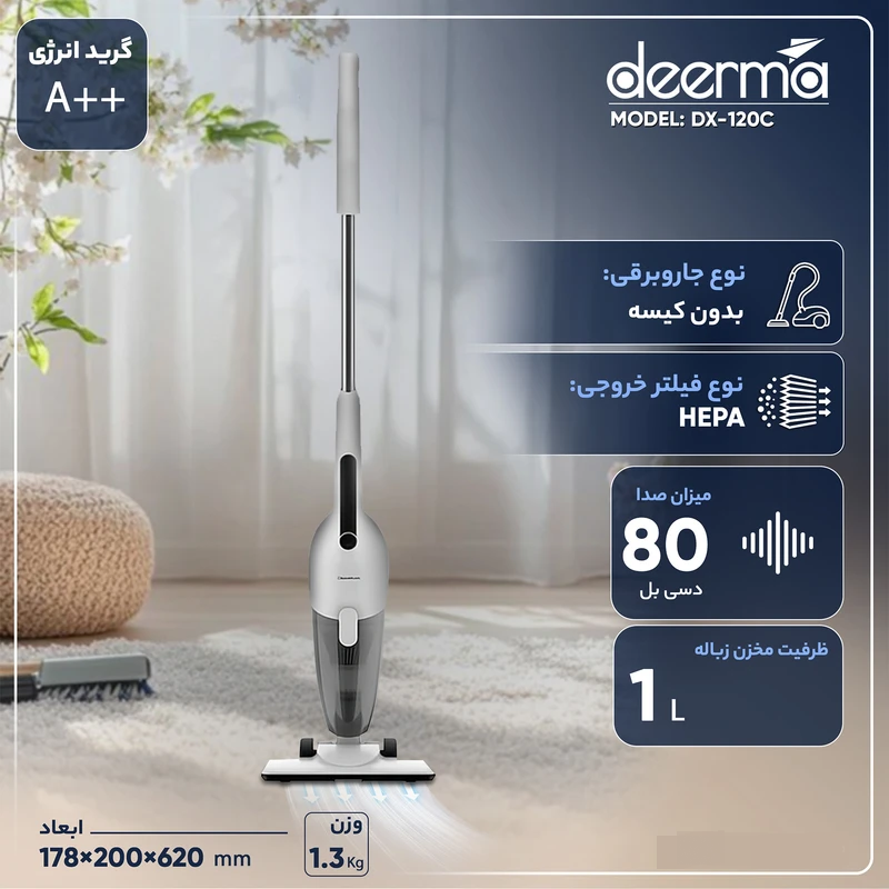 جاروبرقی ایستاده شیائومی مدل Deerma DX120C با طراحی شیک و ارگونومیک، ترکیبی از کارایی و زیبایی را به خانه شما میآورد. این دستگاه با وزن سبک حدود 1.3 کیلوگرم و ابعاد 62 × 20 × 17.8 سانتیمتر، جابجایی و استفاده آسان را فراهم میکند. بدنه از مواد با کیفیت ABS ساخته شده که دوام و مقاومت بالایی را تضمین میکند. موتور قدرتمند 600 واتی این جاروبرقی، توان مکشی معادل 18000 پاسکال را ارائه میدهد که به راحتی گرد و غبار، ذرات ریز و موی حیوانات خانگی را از سطوح مختلف جمعآوری میکند. همچنین، فیلتر HEPA قابل شستوشو در این دستگاه، ذرات آلرژیزا را بهطور مؤثر جذب کرده و از بازگشت آنها به هوای محیط جلوگیری میکند. Deerma DX120C با مخزن گرد و غبار 1.2 لیتری، امکان تمیزکاری طولانیمدت بدون نیاز به تخلیه مکرر را فراهم میکند. طراحی مخزن بهگونهای است که تخلیه آن بهسادگی و بهداشتی انجام میشود. سطح صدای 85 دسیبل این جاروبرقی، تجربهای آرام و بدون مزاحمت را در حین نظافت به ارمغان میآورد. همچنین، این دستگاه با سه سری مختلف عرضه میشود: برس کف برای سطوح صاف مانند سرامیک و فرش، نازل شکاف برای درزها و فضاهای باریک، و برس گرد برای مبلمان و پردهها. این لوازم جانبی متنوع، امکان تمیزکاری کامل و مؤثر در تمامی نقاط منزل را فراهم میکنند.